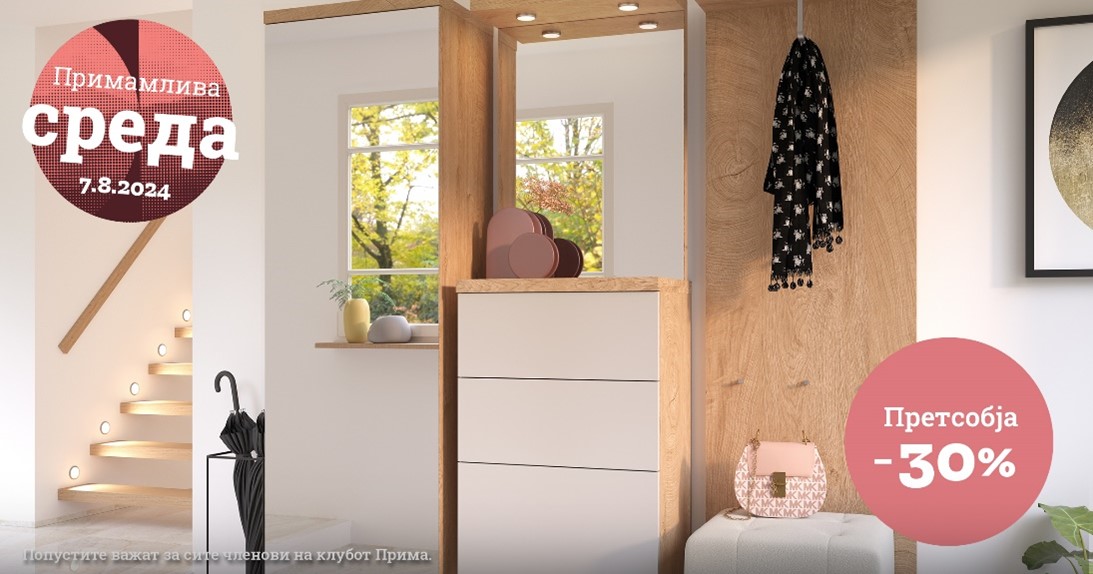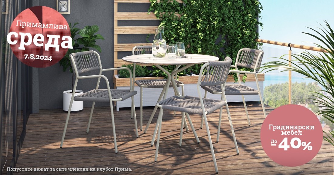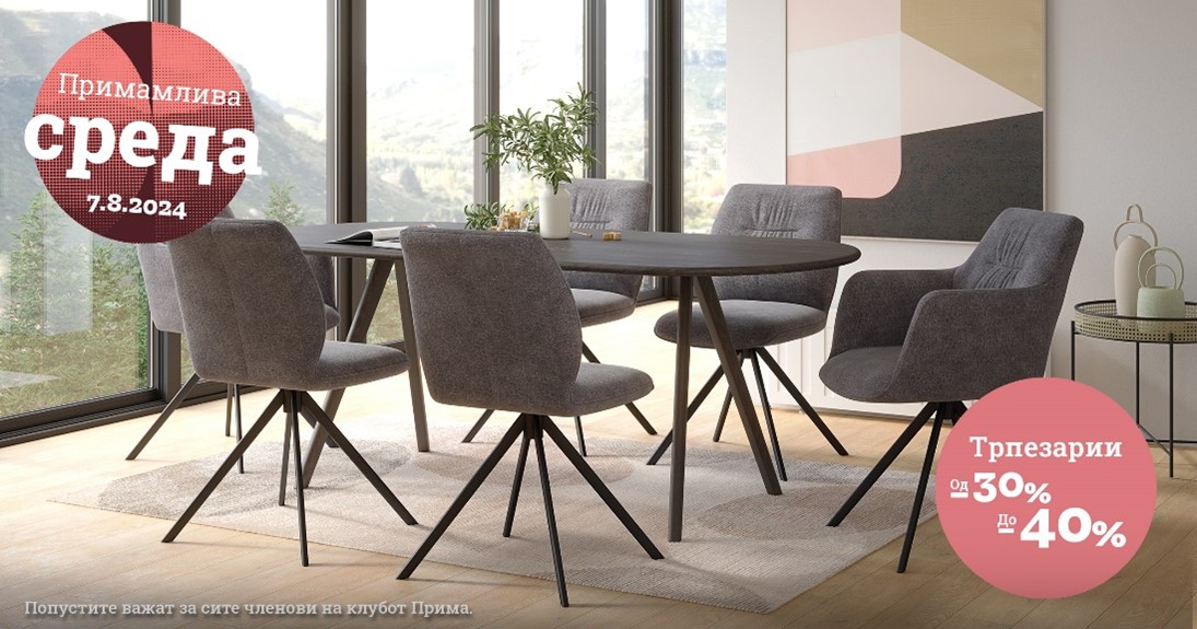 Во првата августовска ПРИМАмлива среда ве очекуваат: трпезарии со попуст од 30 до 40 %, градинарски мебел со намалување до 40 % и претсобја со намалени цени од 30 %. Прима!