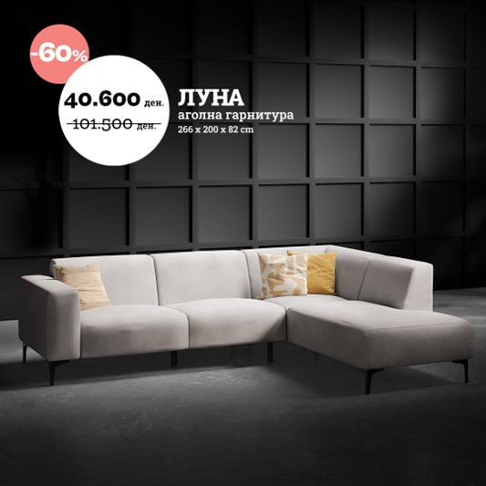 Аголна гарнитура ЛУНА – совршената комбинација на удобност и елеганција, овој Black Friday со неверојатни 60 % попуст. Со Луна внесете нова енергија во вашиот дневен простор. Модерниот дизајн, меките линии и врвниот квалитет ја прават ЛУНА гарнитурата избор број еден за секој дом. Не пропуштајте ја шансата – посетете ги салоните на Прима мебел и опремете го домот со стил!