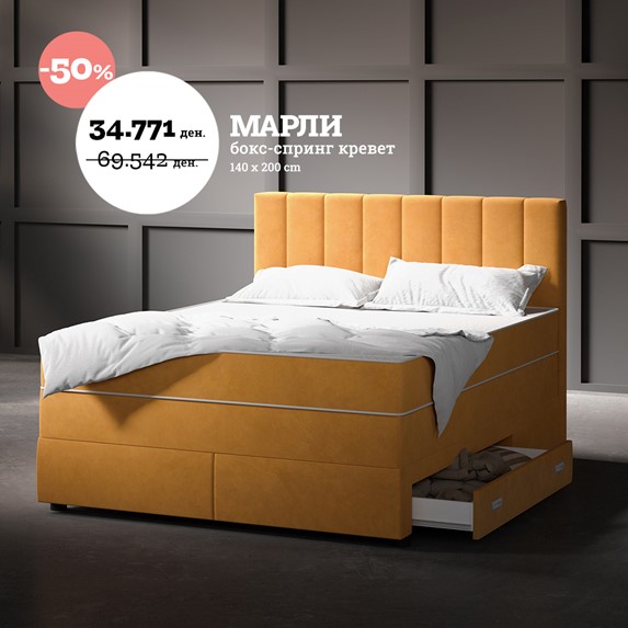 Бокс-спринг кревет Марли – совршен спој на удобност и стил за секоја спална соба. За време на акцијата Black Friday во Прима, Марли е по намалена цена од 50%. Будете се секое утро одморени и полни со енергија. Со својот модерен изглед и врвен квалитет, Марли ќе внесе елеганција и мир во вашиот дом. Не ја пропуштајте оваа можност – посетете ги салоните на Прима и создајте го просторот од соништата!