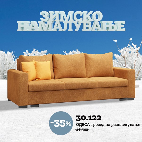 Пристигна големото Зимско намалување со лавина од попусти! Дојдете во салоните на Прима и искористете го попустот до - 45 % на креветите и орманите, до – 50 % на тапацираните гарнитури, попустот до – 40 % на масите и столиците како и попустот на сите кујни. Ве очекуваме!