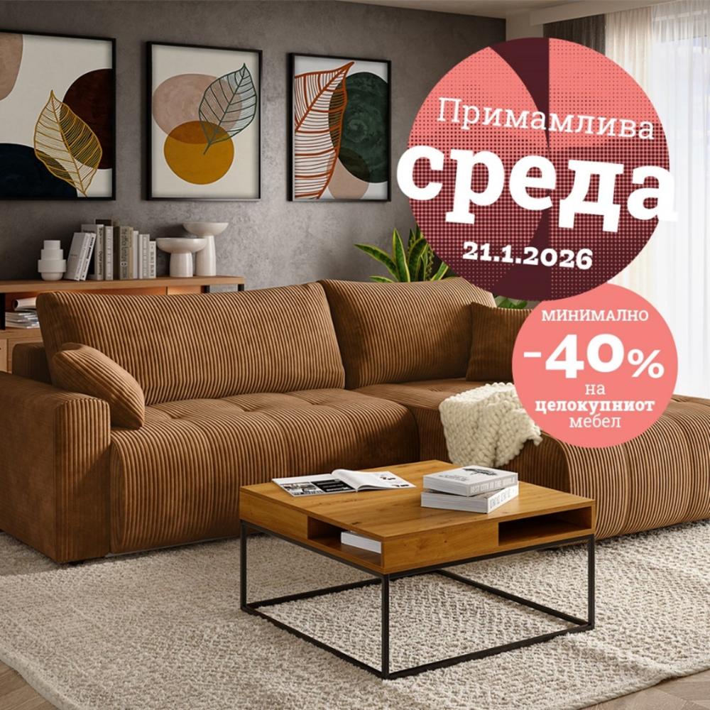 Јануари е месец на нови почетоци. Само за време на оваа јануарска Примамлива среда, искористете ја единствената прилика – минимално - 40 % попуст на апсолутно сиот мебел. Побрзајте во салоните на Прима или на нашиот web-shop затоа што понудата важи само на 21.1.2026 година.