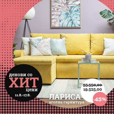 Каков е планот за вечерва? Филм во опуштена атмосфера или забава со пријателите? Што и да одлучите, аголната гарнитура Лариса е тука за вас, а за време на Деновите со ХИТ цени е со намалување од дури 45 %!