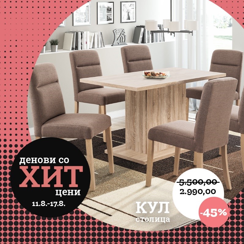 Доволно е да погледнеш во столиците Кул и веќе знаеш дека вечерата со пријателите ќе помине во опуштена атмосфера. Дојдете во сите салони на Прима за време на Деновите со ХИТ цени и искористете го нивното намалување од 45 %.
