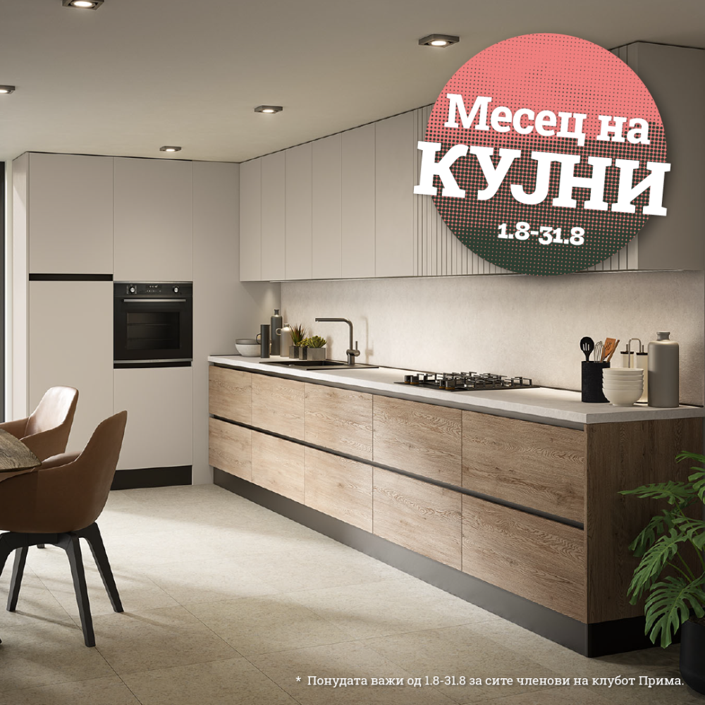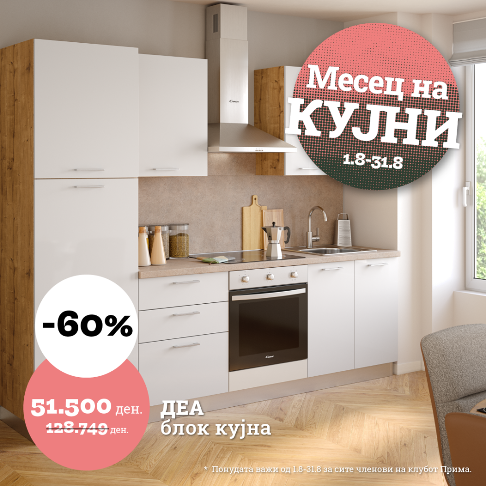 Практичност и стил – на едно место! Во месецот на кујни (1.8 – 31.8), искористете попусти до 60 % и опремете го домот со модерна и функционална блок кујна по супер цена! Совршено решение за секој простор – компактна, уредна и подготвена за сечиј стил на готвење. Погледнете го летокот или посетете ги нашите салони за да ја најдете кујната што ви одговара.