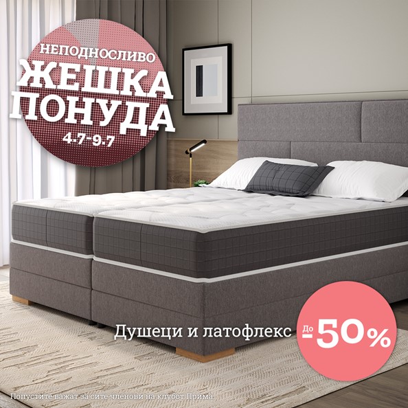 Душеци и латофлекси на кои се забораваат сите секојдневни стресови. J За време на Неподносливото жешка понуда во сите салони на Прима ќе ги најдете по цена намалена за дури 50 %.