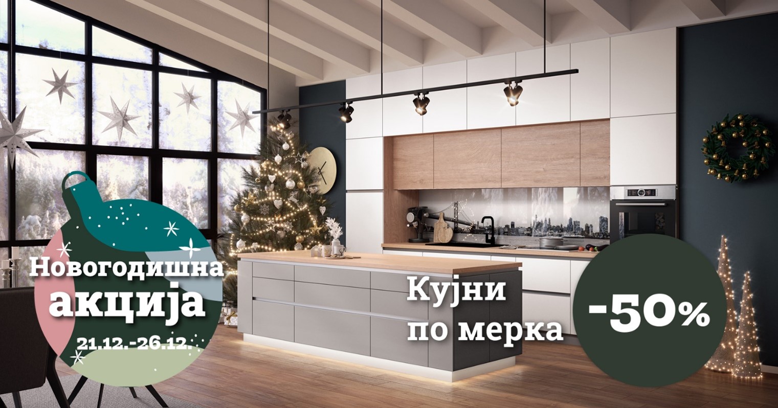 Кујна во која се си има свое место – па дури и омилените украси. Дојдете во нашите салони и искористете ја новогодишната акција на која ви нудиме попуст од 50 % на кујните по мерка.