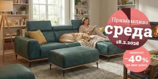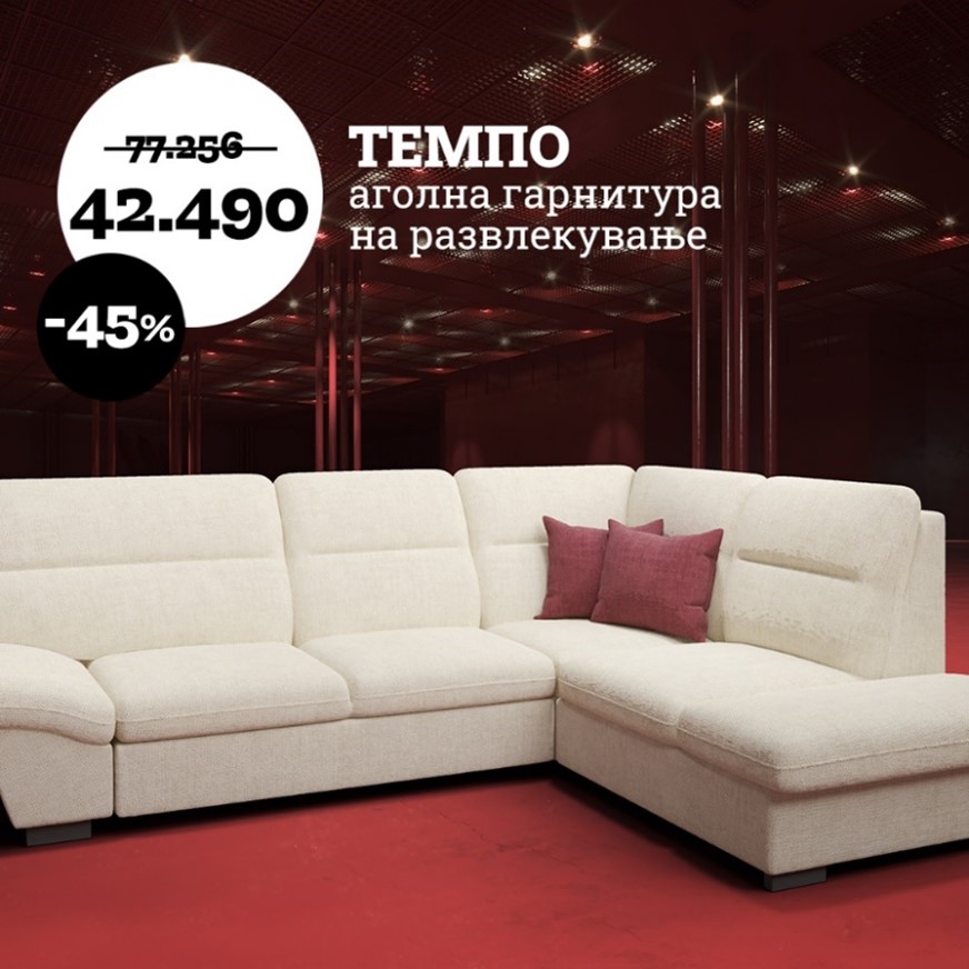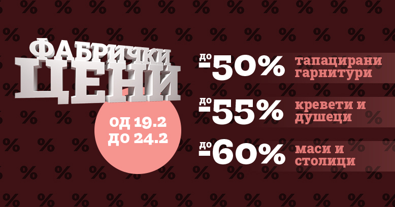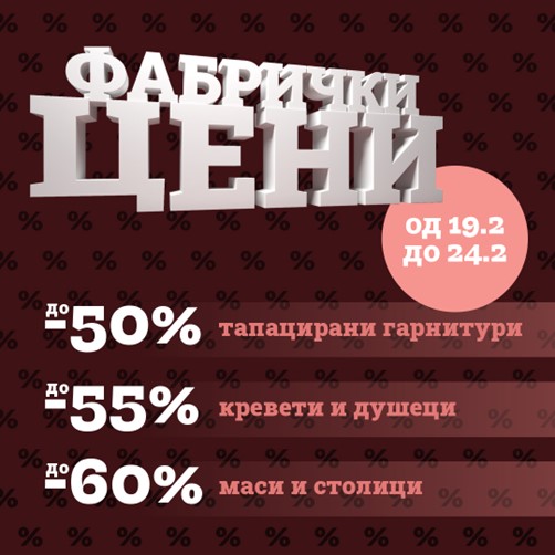 Можност каква што ретко се нуди: опремете го домот со квалитетен мебел и тоа по фабрички цени: тапацирани гарнитури со намалување до 50 %, кревети и душеци до 55 % и маси си столици намалени до 60 %. Не пропуштајте! Прима.