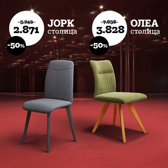 Со различни бои и текстури, со ергономски форми и со дизајн кој „лепи“ на секој стил, столиците Јорк и Олеа ќе го донесат потребното освежување во домот. Искористете ги одличните цени кои ви ги нудиме за време на акцијата Фабрички цени што трае до 24.2.2026. Прима.