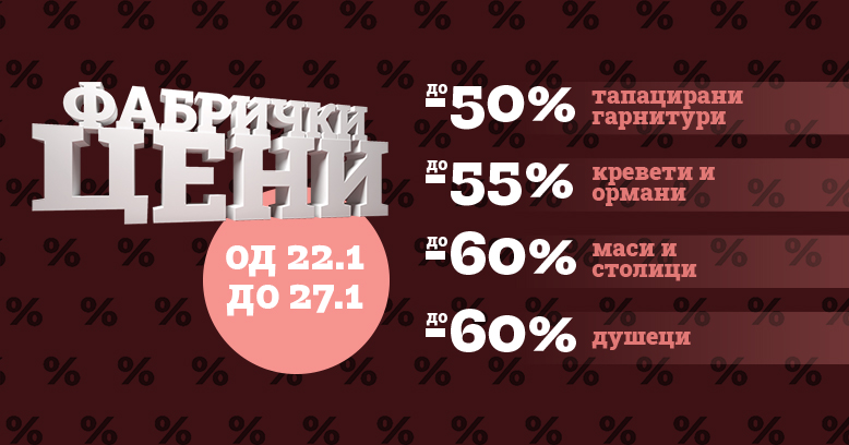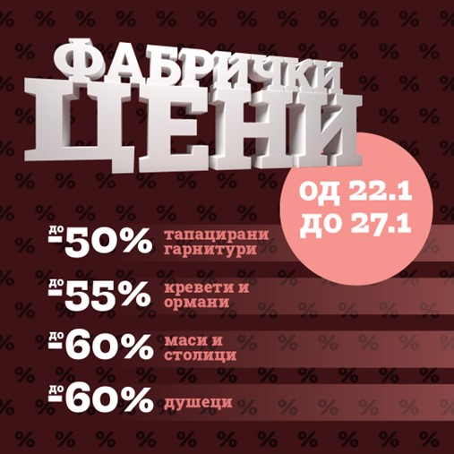 Фабрички цени што го менуваат домот без компромиси. Од 22.1 до 27.1 избери мебел со попусти до - 60% и направи промена што ќе ја чувствуваш секој ден. Прима.