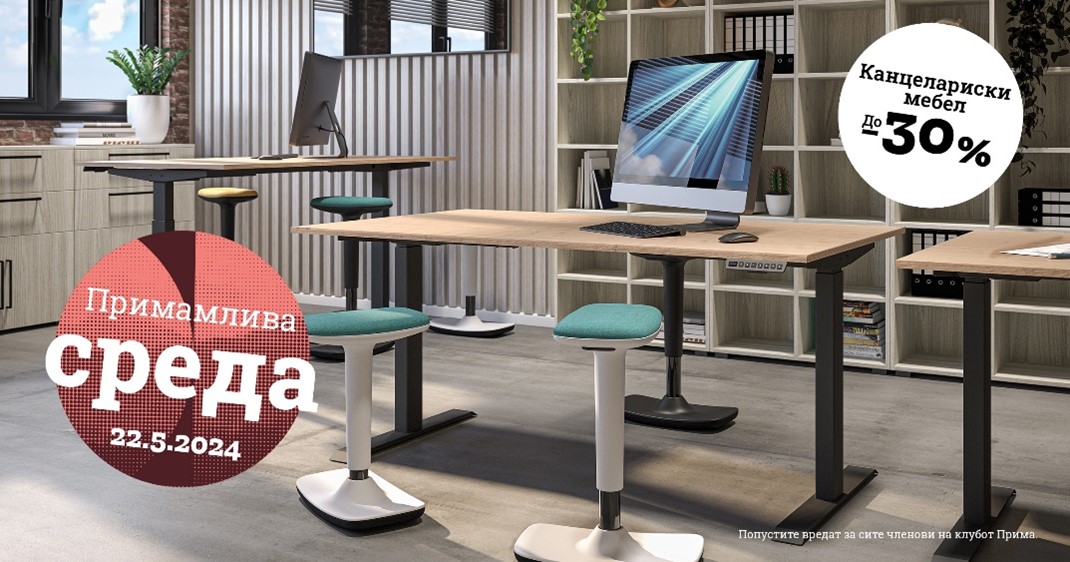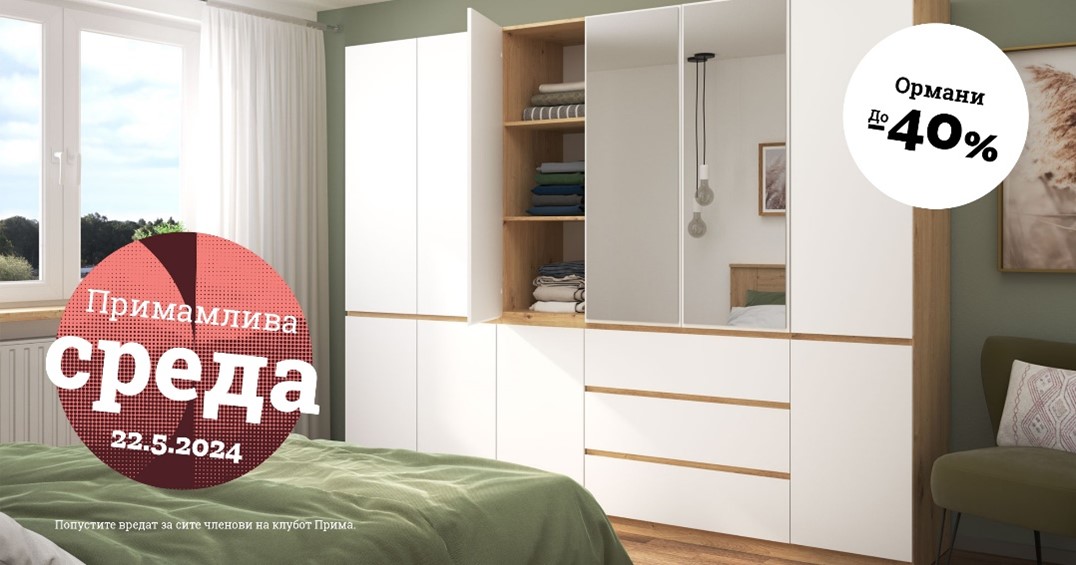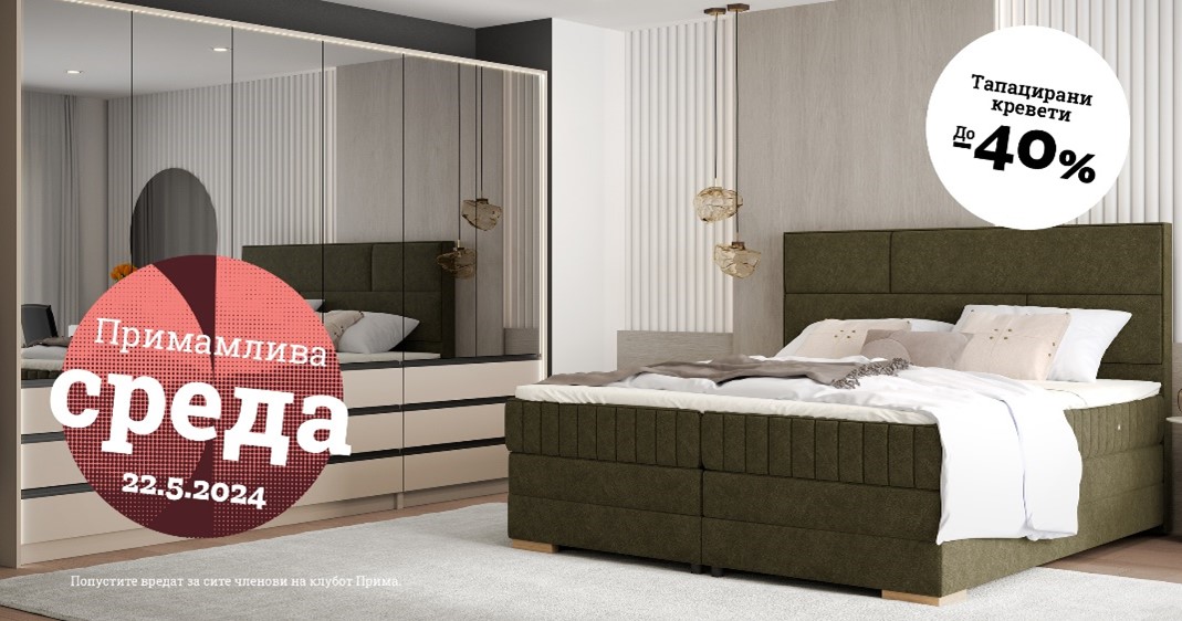ПРИМАмлива среда овој 22 мај? Го чувствувате ли тој порив да дојдете и да го искористите попустот до 40 % на тапацираните кревети и ормани и 30 % на канцеларискиот мебел?