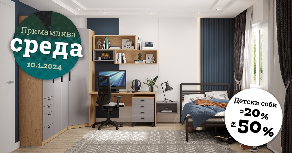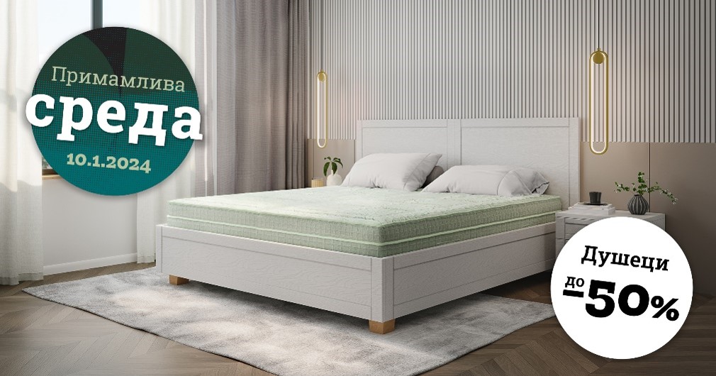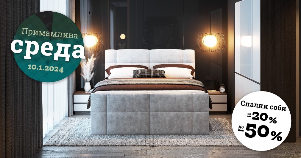 Пристигнува првата Примамлива среда оваа година. 2024та може да биде годината кога вашиот внатрешен простор ќе добие нов сјај, а вие уште во првиот месец од годината можете да одберете некоја од нашите детски, спални соби и душеци кои се по намалена цена до 50 % и бањи од 20 %.