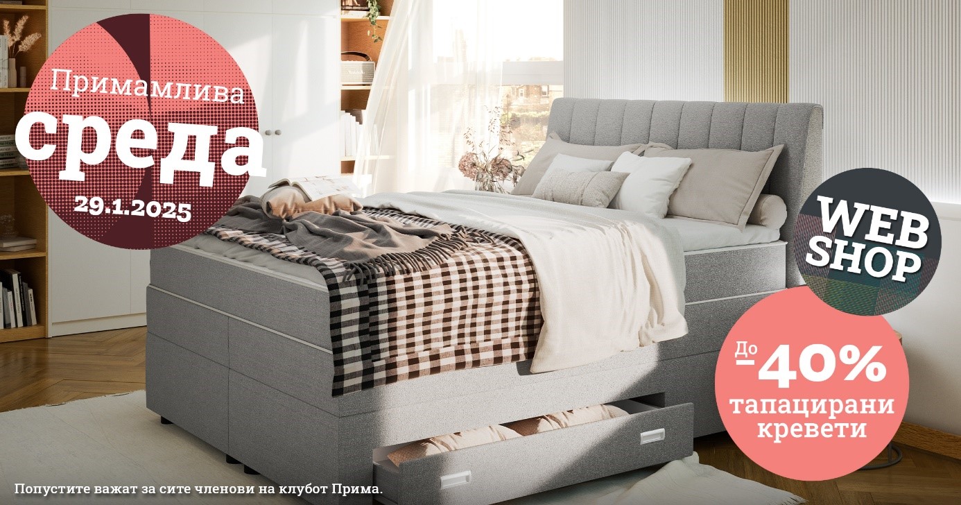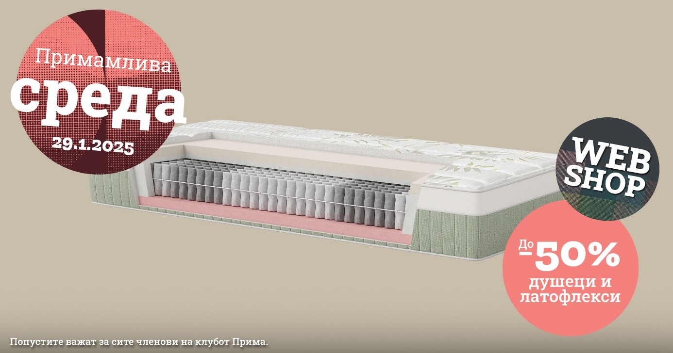 Ова е среда на која навистина не може да ѝ се одолее затоа што изобилува од попусти на душеци и латолфекси кои се со намалување до 50 %, тапацирани кревети намалени до 40 % и тапацирани гарнитури со попуст од 25 до 50 %. Прима.