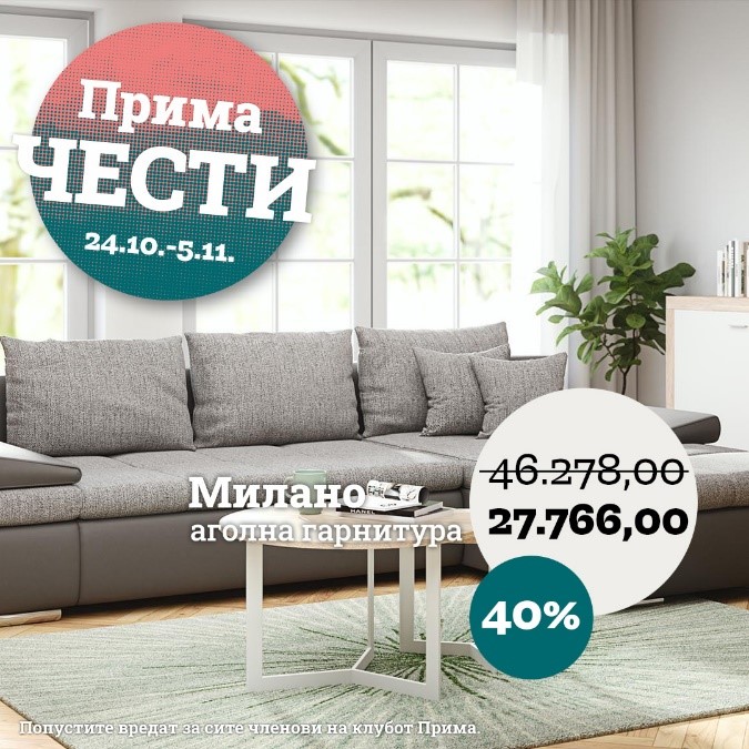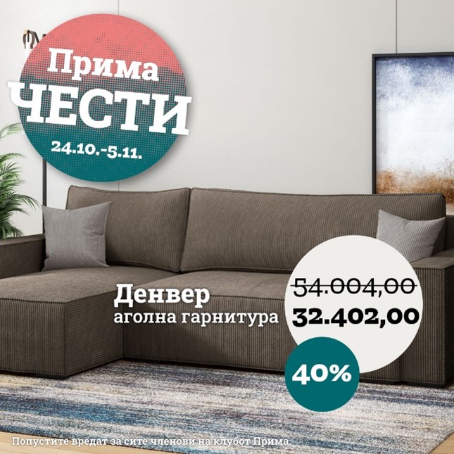 Ѕвездите на вашите спокојни вечери – тапацираните гарнитури на Прима. За време на акцијата Прима чести, посетете ги најблиските салони каде што ќе ги најдете нашите гарнитури одличен попуст и до 40 %.