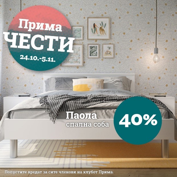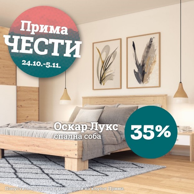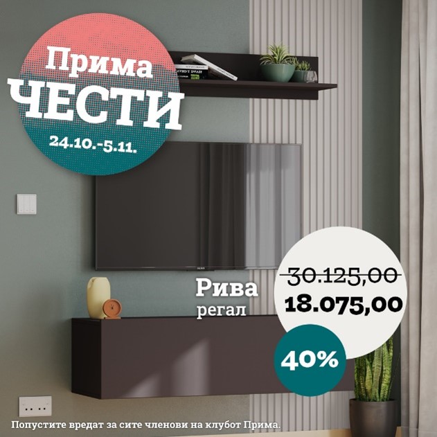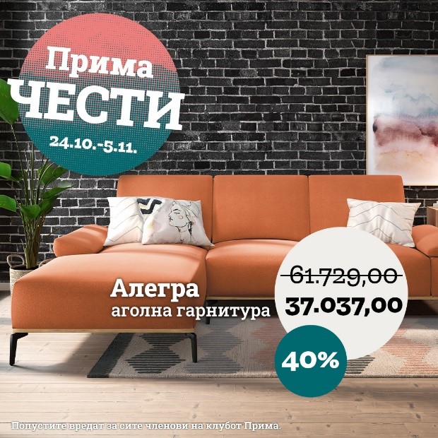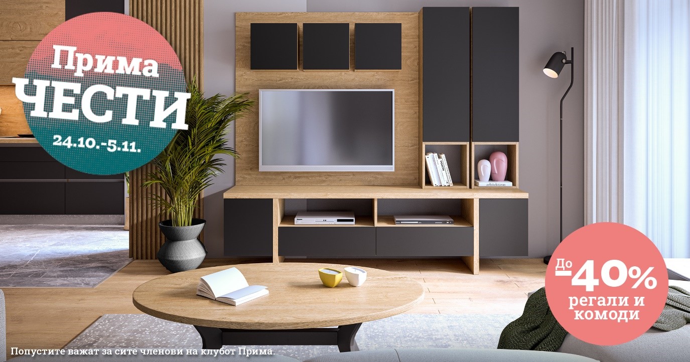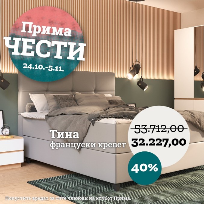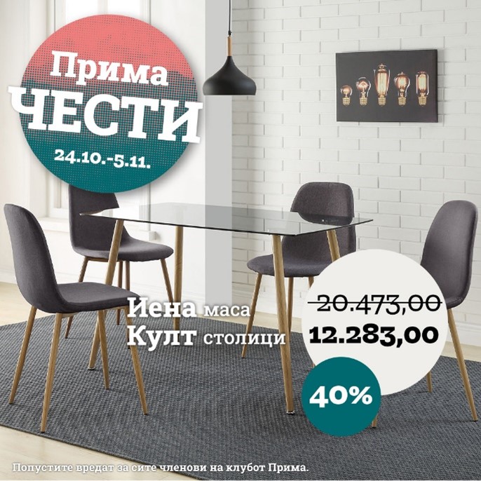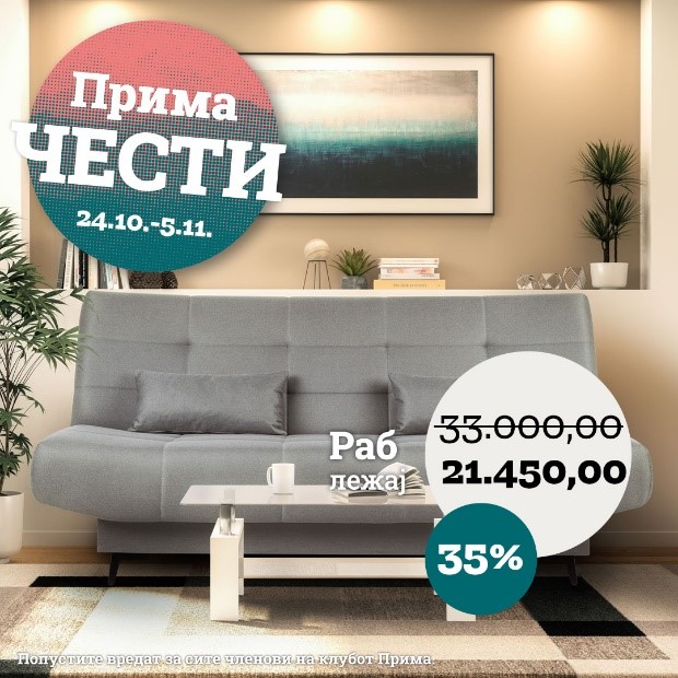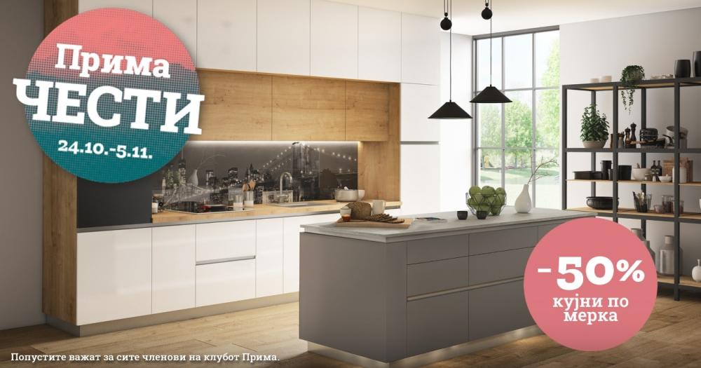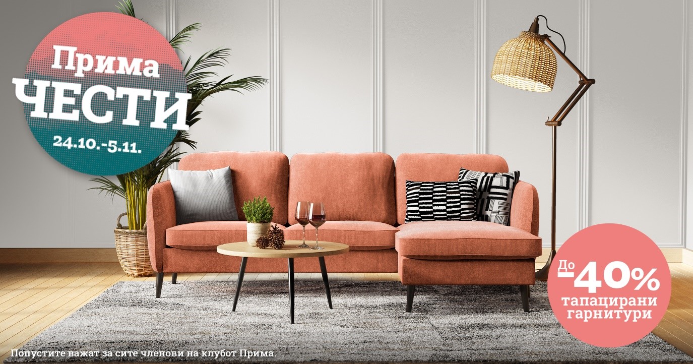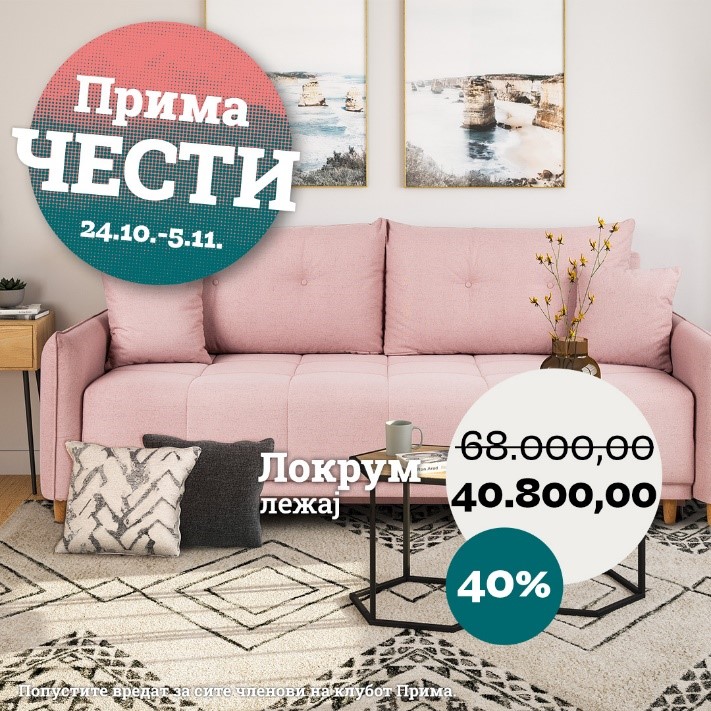 Ја носиме роденденската среќа до сите со акцијата ПРИМА чести која трае од 24.10 до 5.11 и во која можете да ги искористите попустите од 40 % на тапацираните гарнитури, 50 % на кујните по мерка и до 40 % на регалите и комодите.