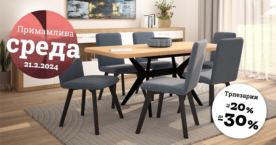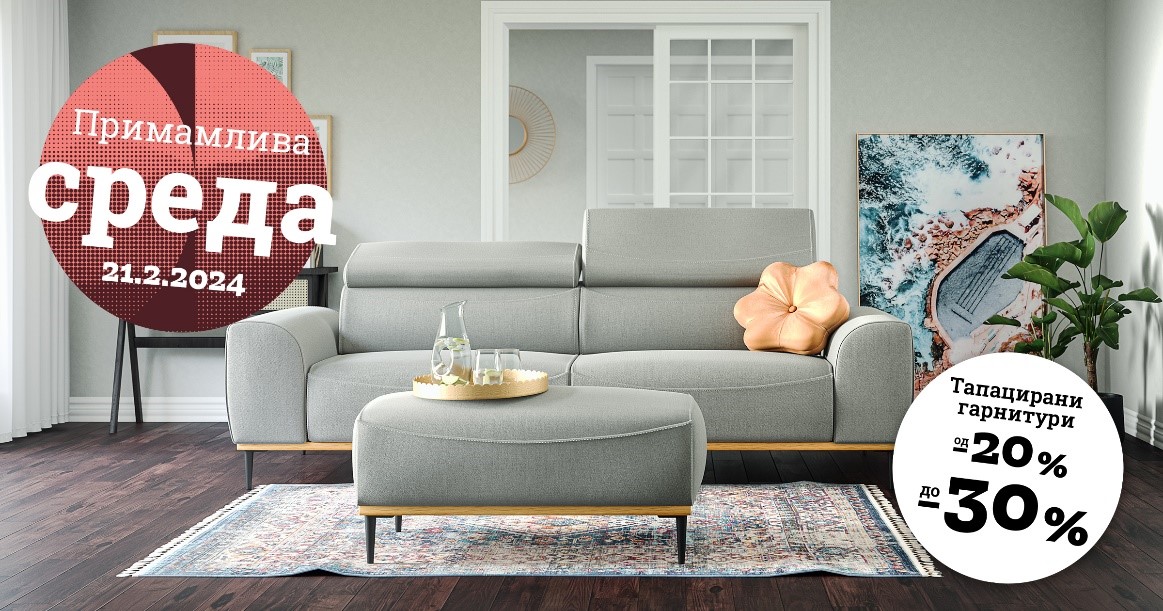 Уредете го станот да трае и секогаш да биде во тренд. Оваа ПРИМАмлива среда дојдете и искористете го попустот од 20 до 30 % на тапацираните гарнитури, како и на трпезариите. Прима.