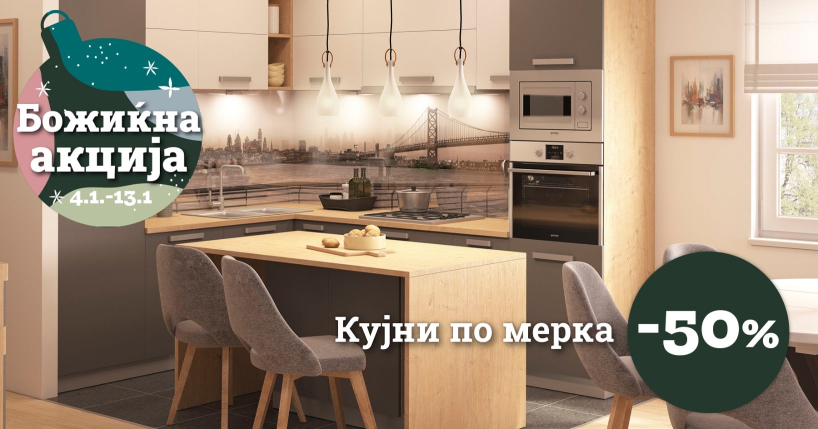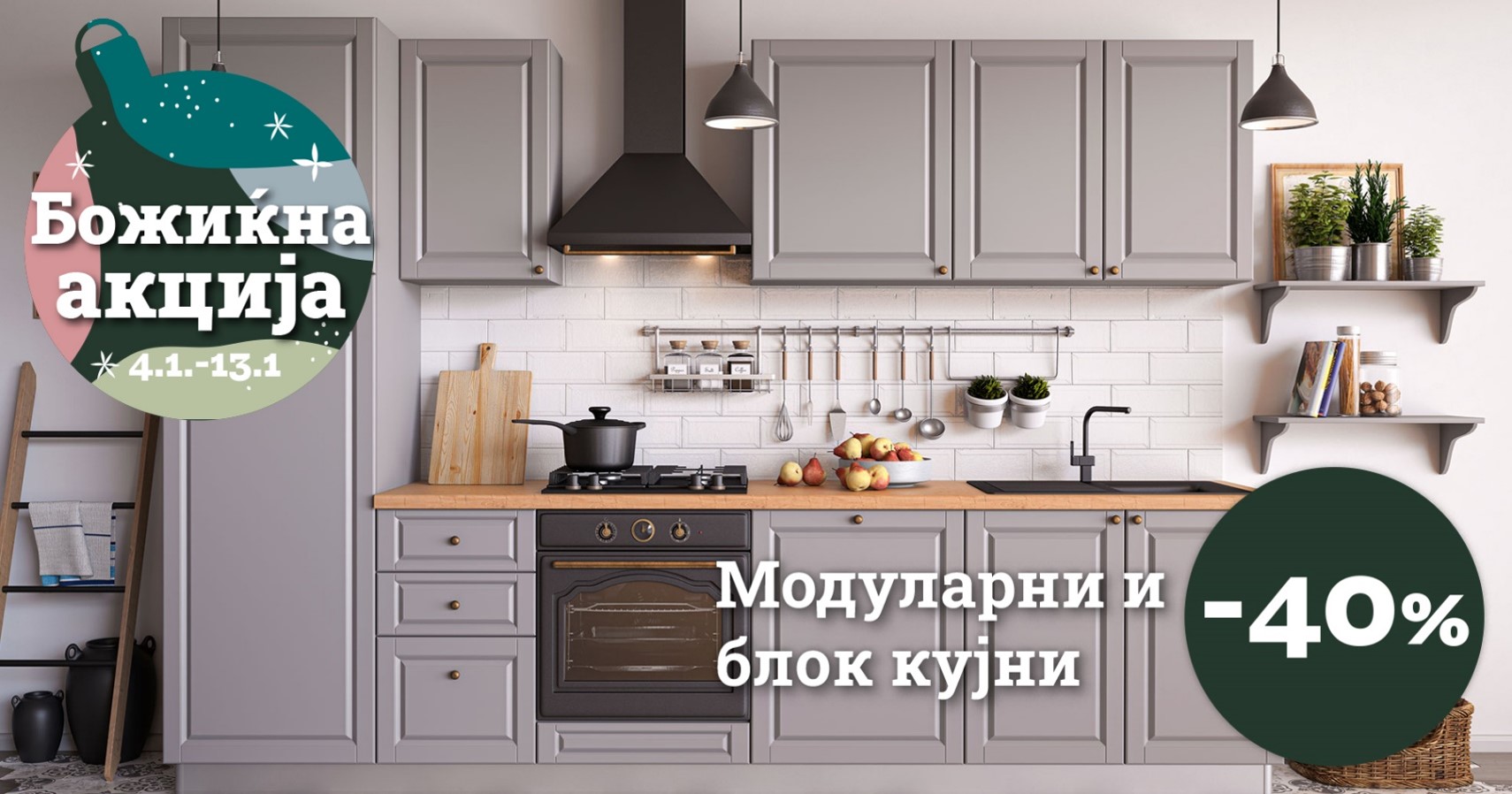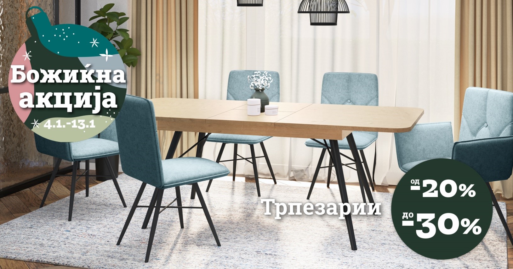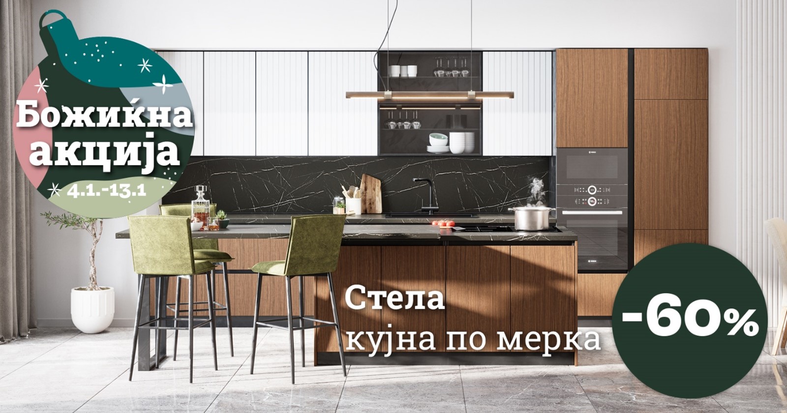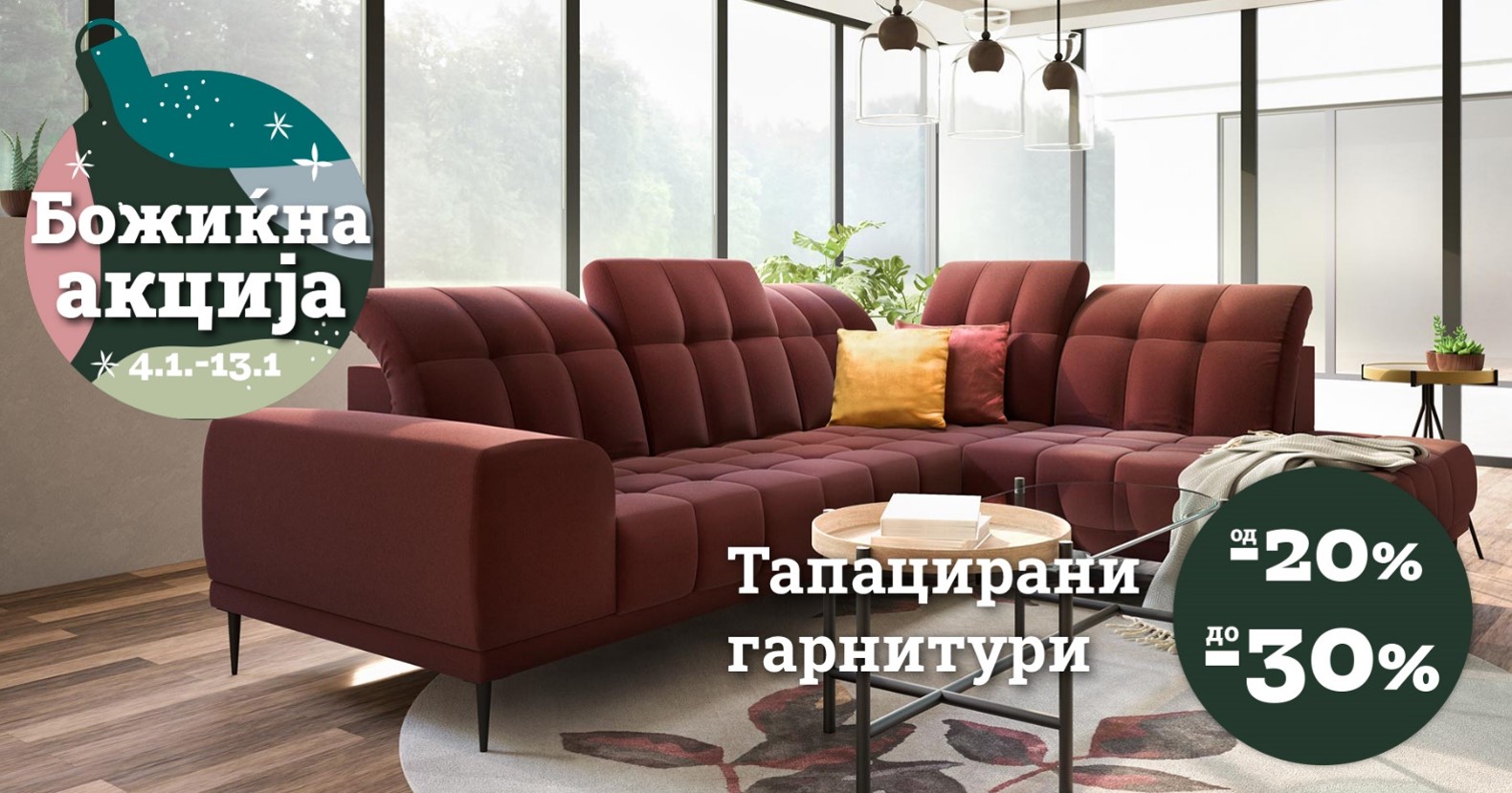 Дојдете во нашите салони и искористете ги попустите од 20 до 30 % на тапацираните гарнитури и трпезариите, 40 % на модуларните и блок кујни, 50 % на кујните по мерка и ексклузивниот попуст од 60 % на кујната по мерка Стела.