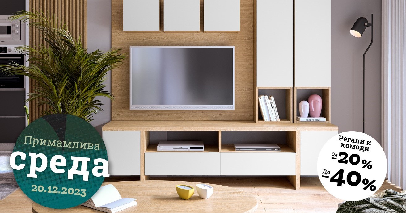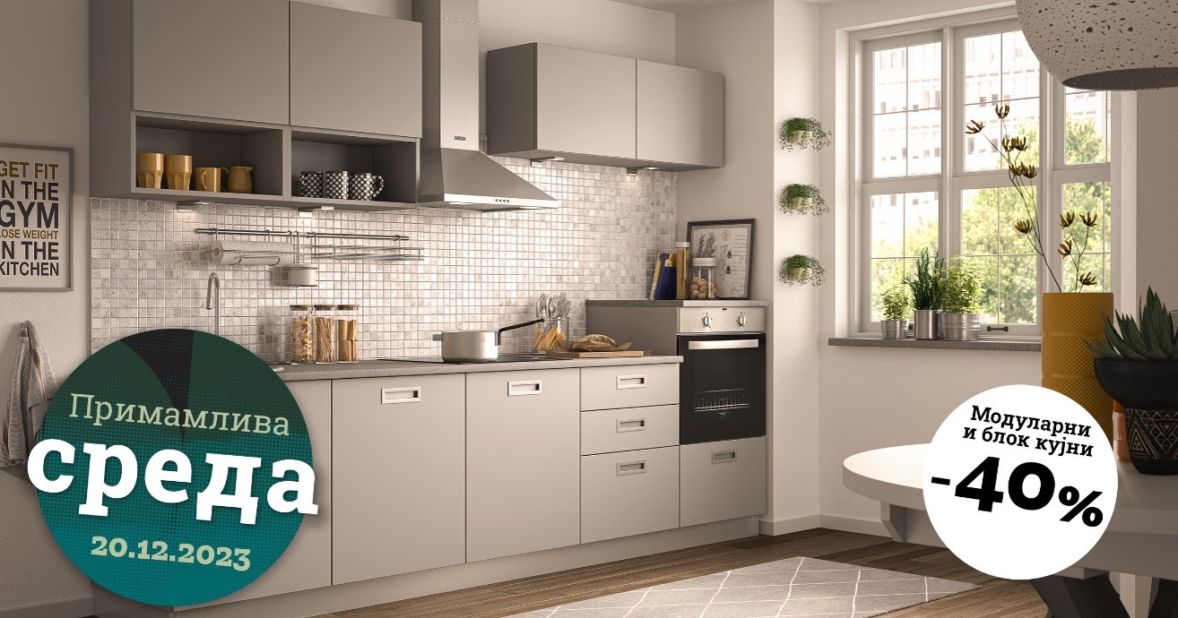 Новата ПРИМАмлива среда е тука! Направете избор од модуларни кујни со попуст од 40 % и регали и комоди за дневната соба со намалување од 20 % до 40 %.