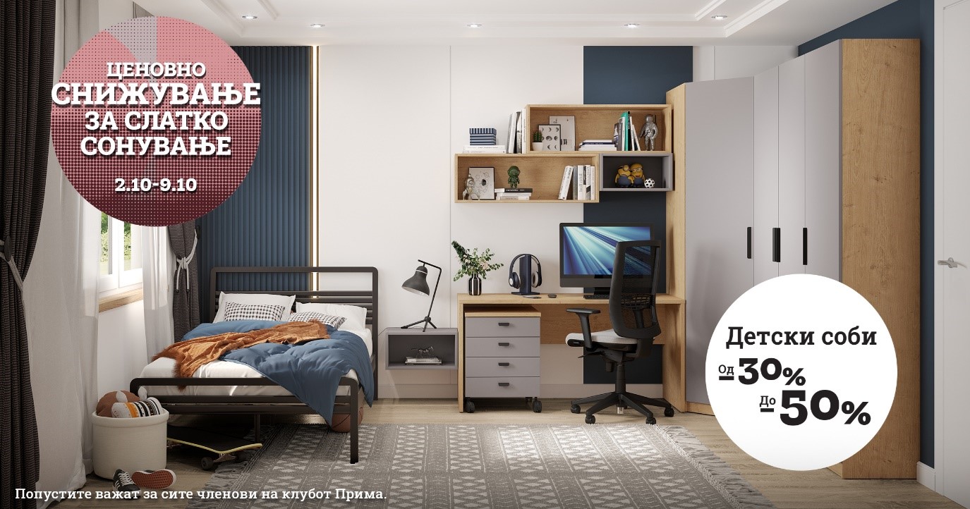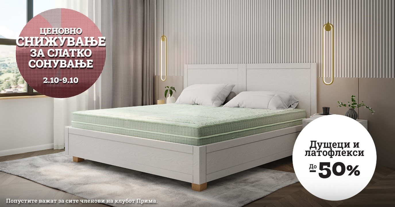 Периодот од 2.10 до 9.10 е време за ценовно снижување за слатко сонување. Салоните на Прима подготвено ве очекуваат со намалени цени од 30 до 50 % на спални соби и тапацирани кревети, од 30 до 50 % на детски соби, до 50 % на латофлекси и 20 % попуст на канцелариски мебел.