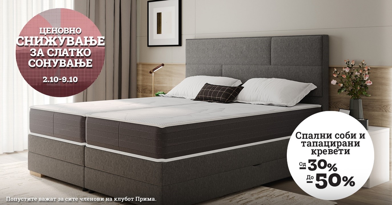 Ова утро разбудете се наспани. Одберете спални соби или тапацирани кревети на Прима и добијте попуст од 30 до 50 %.