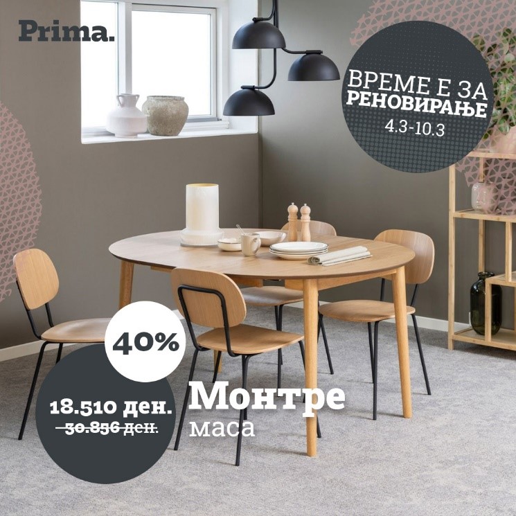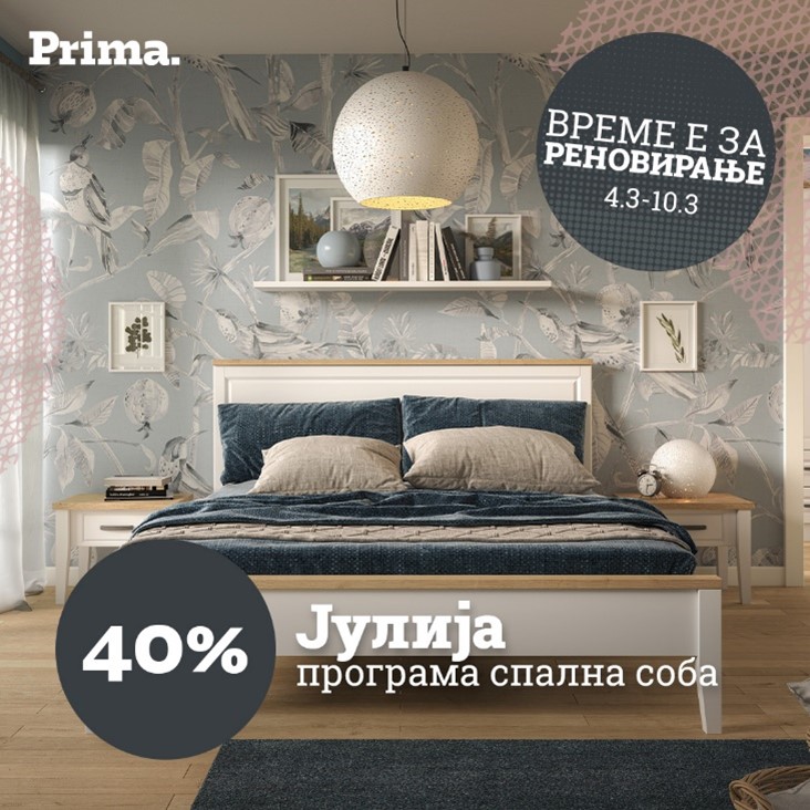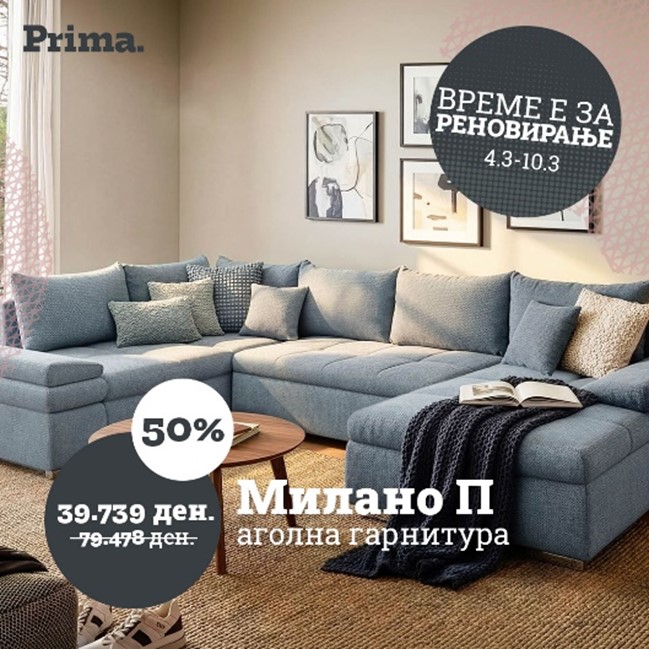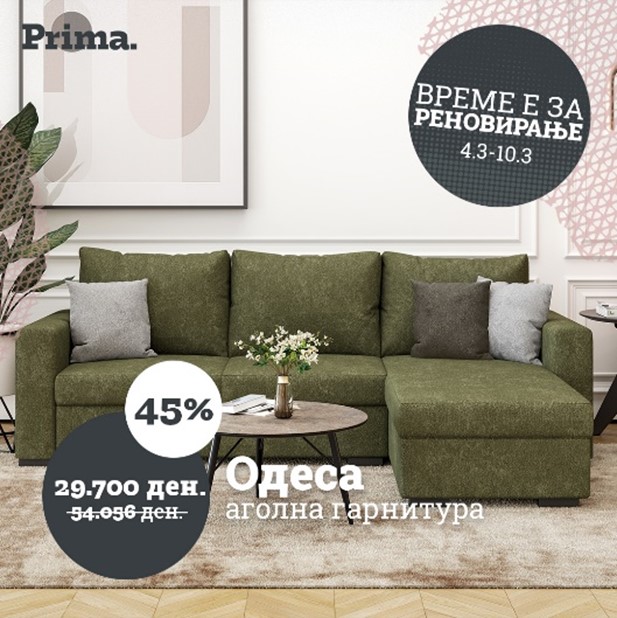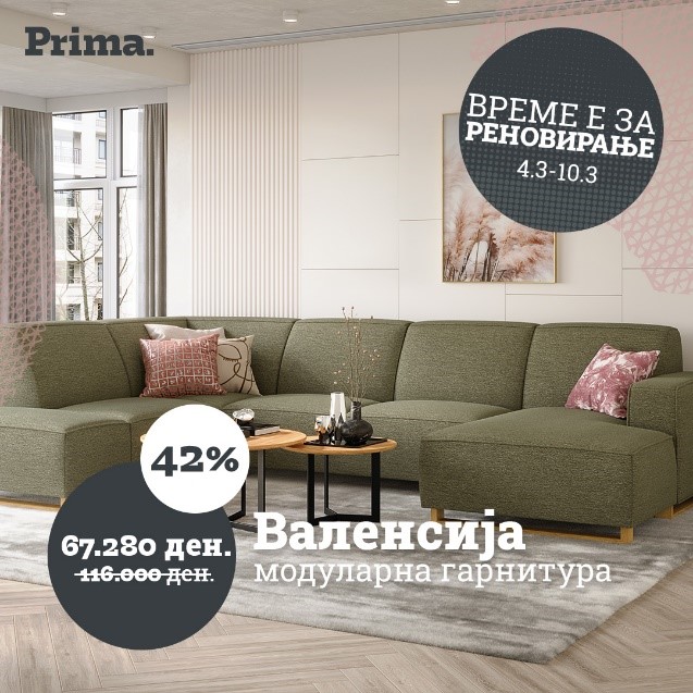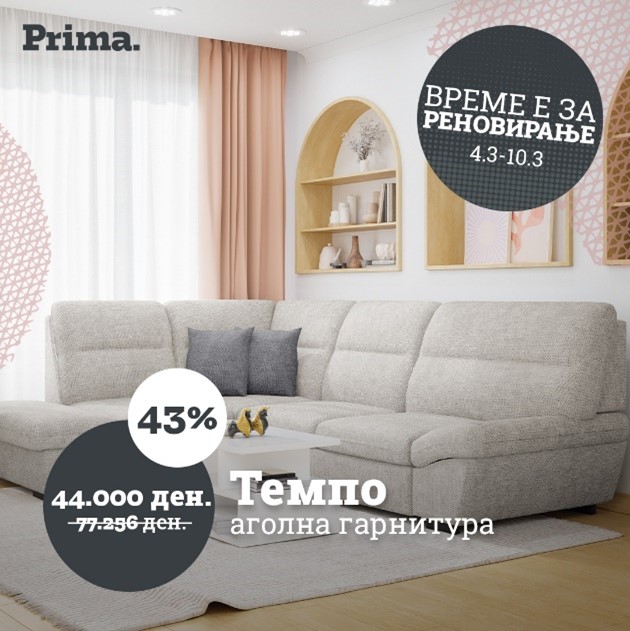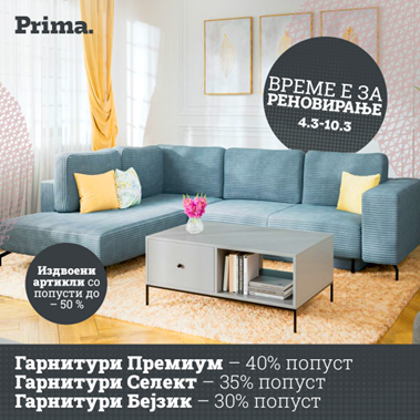 Големи попусти – уште поголеми заштеди! Дојдете и добијте 40 % попуст на колекциите за премиум гарнитурите, 35 % попуст на колекциите за селект гарнитурите, 30 % попуст на колекциите за бејзик гарнитурите и до 50 % попуст на избрани артикли! Искористете ја шансата и добијте повеќе за помалку – само сега! Прима.