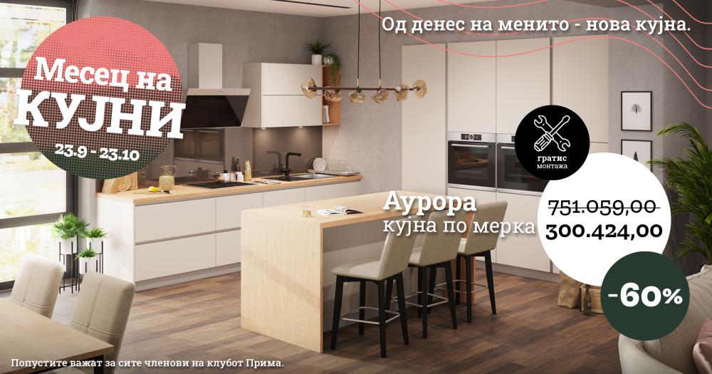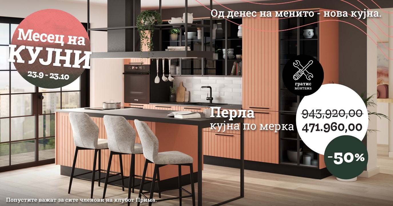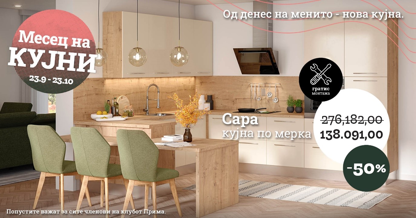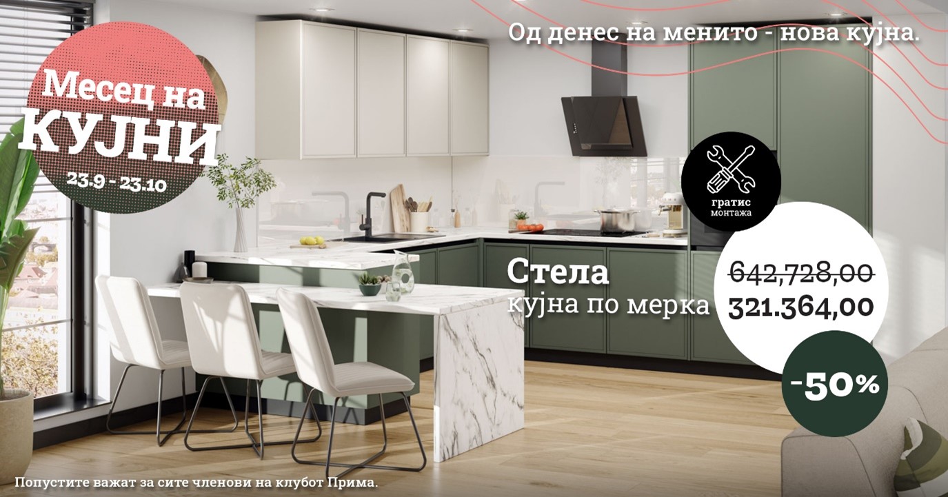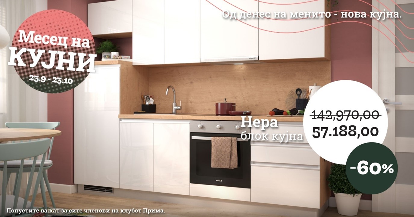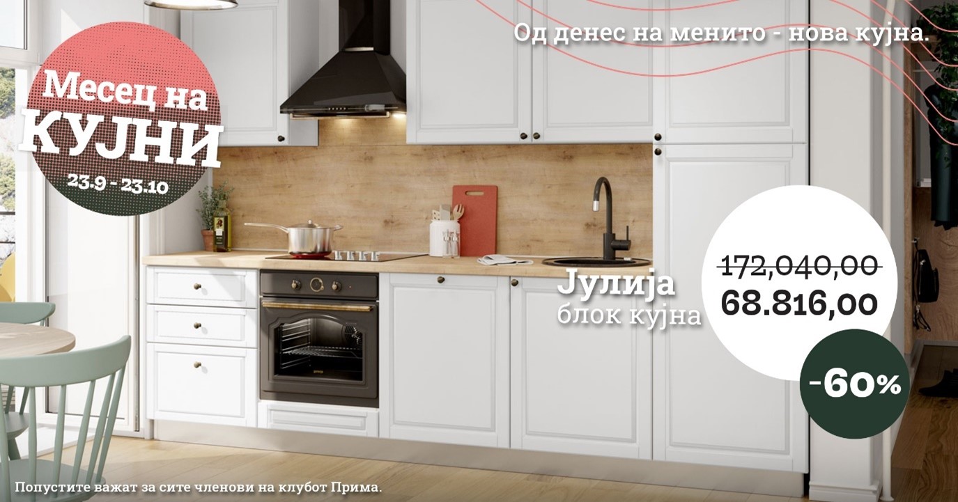 Зачинете го домот со нова кујна од Прима. Од 23.9 почнува Месецот на кујни каде ќе ги најдете сите кујни по мерка со попуст до 60 % со вклучена бесплатна монтажа. Покрај тоа, за време на Месецот на кујни во Прима-летокот можете да ги разгледате и останатите кујни кои се наоѓаат на нашето мени и се по намалени цени.