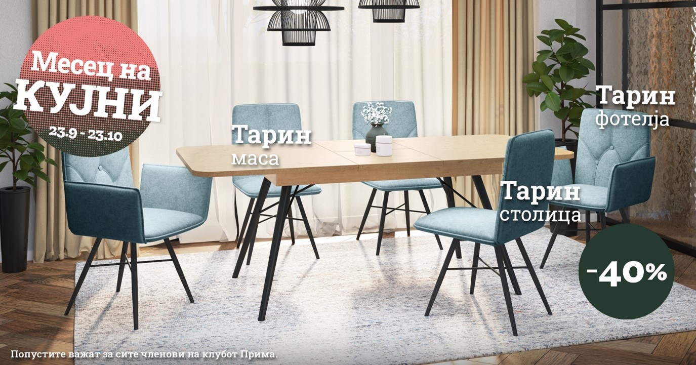 Време е за нова трпезарија. Прима има супер решение за тоа, и тоа по намалена цена од 40%. Сега е совршено време за нова столица и/или фотелја Тарин и нова трпезариска маса.