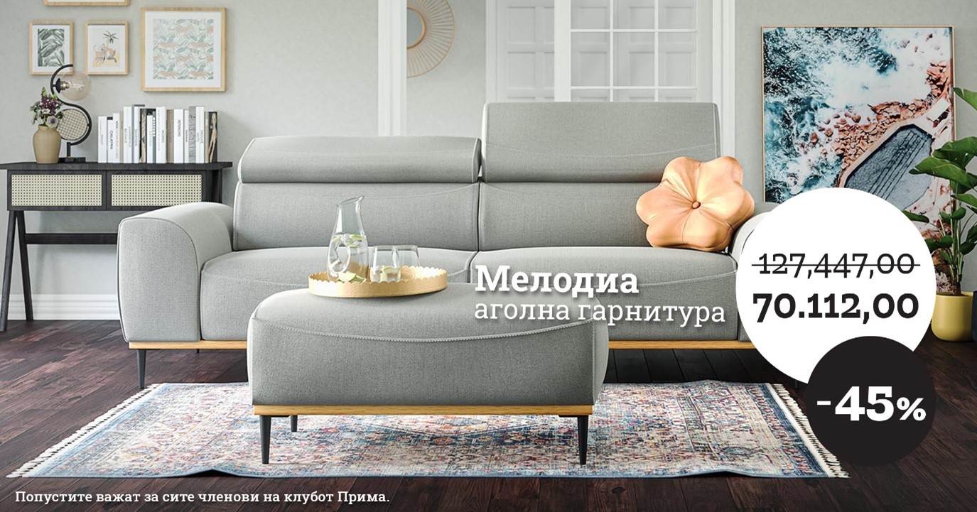 Освежете ја вашата дневна соба со нова гарнитура. Вашиот дом ќе добие нов шарм со аголната гарнитура Мелодија која овој период е по намалена цена од 45 %. Ве очекуваме во нашите салони.