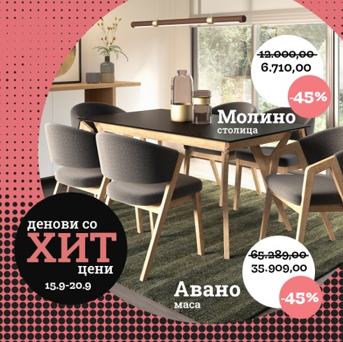 Деновите со ХИТ цени ви носат одлични заштеди од 45 % на масата Авано и столиците Молино.