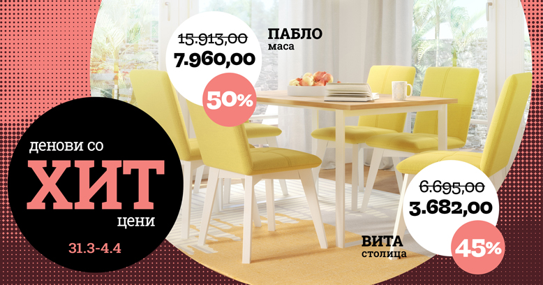 Деновите со ХИТ цени во Прима ви носат намалување од 50 % на трпезариската маса Пабло и намалување од 45 % на столиците Вита.