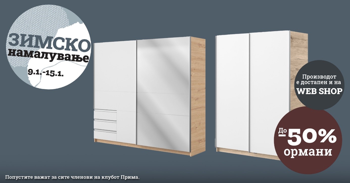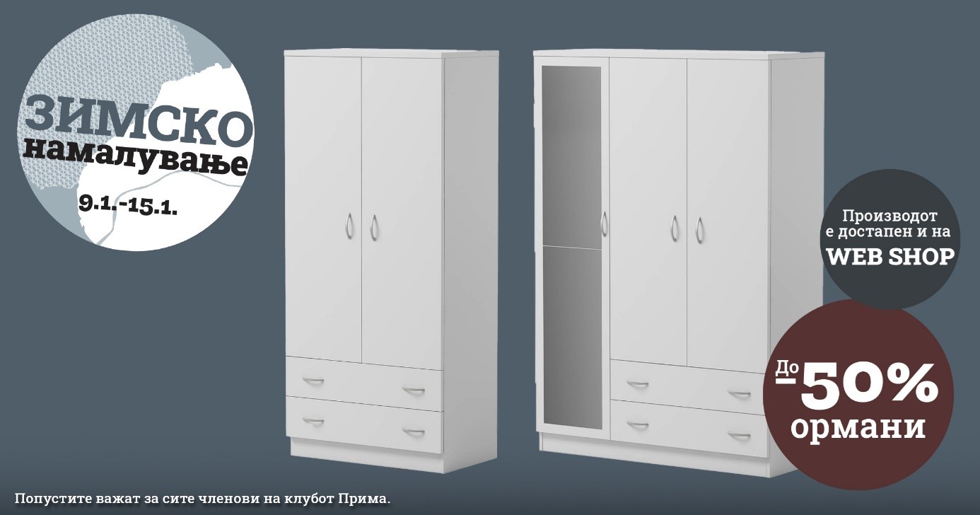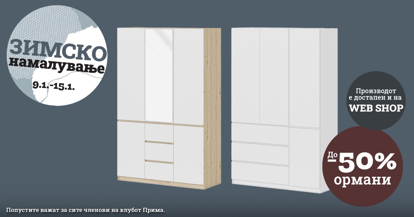 Нека биде се на свое место! Направи си орман 100 % по твое бирајќи од големиот број димензии и декори и искористи го намалувањето до 50 % на сите ормани на Прима кое трае до 15.1. Не заборавајте да го посетите и нашиот web-shop уживајќи во удобноста на вашиот дом.