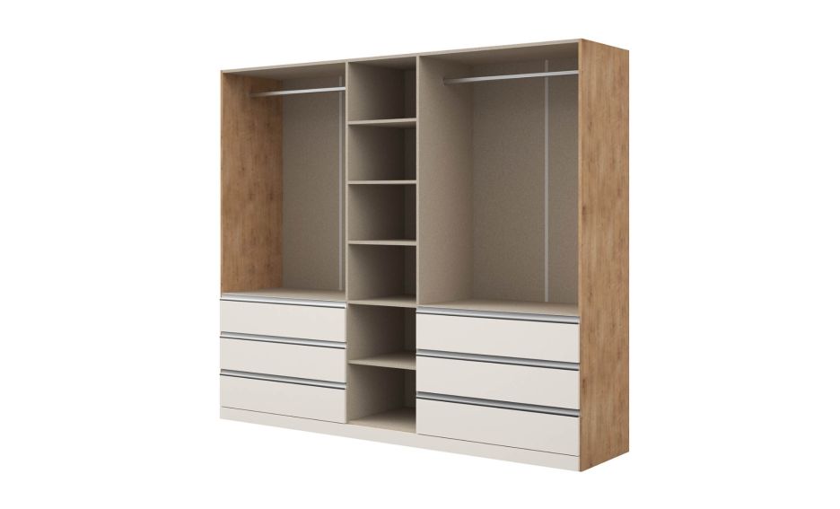 Najelegantniji zaokretni ormari – visoki 220 cm, dostupni i u kliznoj verziji. Luksuzna unutrašnjost – svijetli tekstilni dekor koji odiše elegancijom i jednostavno se održava. Vrhunska organizacija – široke i prostrane Metabox ladice s bešumnim zatvaranjem, praktične duboke police, niz odjeljaka odjeljci i šipke za dugo i kratko vješanje – sve ima svoje mjesto. Personalizirana oprema za unutrašnjost – možete odabrati bočne police za cipele, vješalice za kravate i hlače ili druge opcije za savršeno složenu garderobu. Veliki izbor dekora i ručkica – crne mat ili aluminijske ručkice za sofisticirani izgled. Zaokretna vrata po vašem izboru – klasična u jednom dekoru ili s ugrađenim ogledalom. Ukrasni opšav s ugradbenom rasvjetom – za još luksuzniju atmosferu u vašem domu odaberite ukrasni okvir koji će učiniti ormar još elegantnijim. Najkvalitetniji materijali – izrađeni od posebno biranih materijala među kojima je i izdržljivi iveral koji osigurava dugotrajnost.